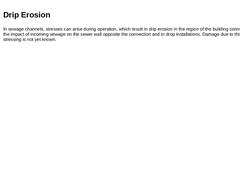 In sewage channels, stresses can arise during operation, which result in drip erosion in the region of the building connections due to the impact of incoming sewage on the sewer wall opposite the connection and in drop installations. Damage due to this type of stressing is not yet known.