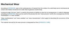 According to [DIN50320], wear is the continuing loss of material from the surface of a solid body due to mechanical action, i.e. contact and relative movement of a solid, fluid or gaseous counter body. In general usage, the term "wear" is used for the process of attrition as also for its consequences. In order to distinguish them, according to [DIN50320], there can be used for the process the term "wear process" and for the consequences the terms "…