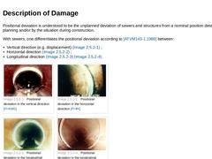Positional deviation is understood to be the unplanned deviation of sewers and structures from a nominal position determined by planning and/or by the situation during construction. With sewers, one differentiates the positional deviation according to [ATVM143-1:1989] between: - Vertical direction (e.g. displacement) (Bild 2.4.1) ;