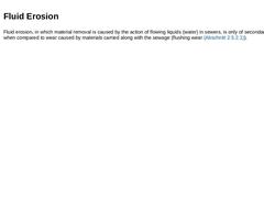 Fluid erosion, in which material removal is caused by the action of flowing liquids (water) in sewers, is only of secondary importance when compared to wear caused by materials carried along with the sewage (flushing wear (Abschnitt 2.5.2.1)).