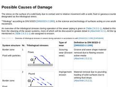 The stress on the surface of a solid body due to contact and to relative movement with a solid, fluid or gaseous counter body is designated as the tribological stress. "Tribology" according to DIN 50323 [DIN50323-2:1995], is the science and technology of surfaces acting on one another in relative movement. An overview of the tribological stresses during operation of the sewer piping is given in Tabelle 2.5.2. Added to this are stresses from the cleaning …