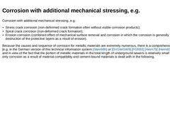 Corrosion with additional mechanical stressing, e.g. - Stress crack corrosion (non-deformed crack formation often without visible corrosion products);