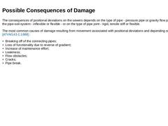 The consequences of positional deviations on the sewers depends on the type of pipe - pressure pipe or gravity flow pipe - and on the pipe-soil-system - inflexible or flexible - or on the type of pipe joint - rigid, tensile stiff or flexible. The most common causes of damage resulting from movement associated with positional deviations and depending on its extent are [ATVM143-1:1989] : - Breaking off of the connecting pipes;