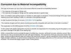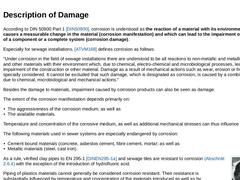 According to DIN 50900 Part 1 [DIN50900], corrosion is understood as the reaction of a material with its environment, which causes a measurable change in the material (corrosion manifestation) and which can lead to the impairment of the function of a component or a complete system (corrosion damage). Especially for sewage installations, [ATVM168] defines corrosion as follows: "Under corrosion in the field of sewage installations there are understood …