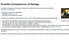 (Image: Sewer blockage caused by deposits [FI-KMG]) Possible consequences of damage caused by flow obstacles in sewer systems according to [ATVM143-1:1989] are: - Reduction of hydraulic capabilities;