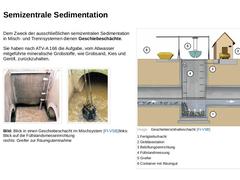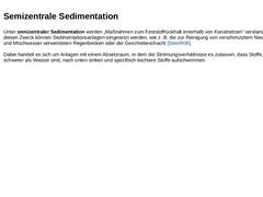 Unter semizentraler Sedimentation werden „Maßnahmen zum Feststoffrückhalt innerhalb von Kanalnetzen“ verstanden. Für diesen Zweck können Sedimentationsanlagen eingesetzt werden, wie z. B. die zur Reinigung von verschmutztem Niederschlags- und Mischwasser verwendeten Regenbecken oder der Geschiebeschacht [SteinR08].
