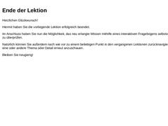Herzlichen Glückwunsch! Hiermit haben Sie die vorliegende Lektion erfolgreich beendet. Im Anschluss haben Sie nun die Möglichkeit, das neu erlangte Wissen mithilfe eines interaktiven Fragebogens selbstverantwortlich zu überprüfen. Natürlich können Sie außerdem nach wie vor zu einem beliebigen Punkt in den vergangenen Lektionen zurücknavigieren, um das eine oder andere Thema oder Detail erneut anzuschauen. Bleiben Sie neugierig!