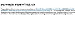 Unter dezentralem Feststoffrückhalt werden nachfolgend „Maßnahmen zum Rückhalt von Feststoffen am Ort des Anfalls vor Einleitung in die Kanalisation“ verstanden. Nach Auffassung vieler Autoren ( [Grott1991] [Giesl1997] [Kraut2000] [Stotz1998] [Somme2004a] [Somme2004] [Fraen2005] [Hilli2005] [SteinR05]) gilt der über Straßenabläufe erfolgende Regenabfluss von Bodenoberflächen als Haupteintragsquelle für mineralischen Feststoffeinträge, die wiederum …