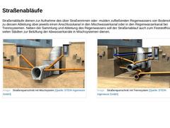 Straßenabläufe dienen zur Aufnahme des über Straßenrinnen oder -mulden zufließenden Regenwassers von Bodenoberflächen und zu dessen Ableitung über jeweils einen Anschlusskanal in den Mischwasserkanal oder in den Regenwasserkanal bei Trennsystemen. Neben der Sammlung und Ableitung des Regenwassers soll der Straßenablauf auch zum Feststoffrückhalt sowie in vielen Städten zur Belüftung der Abwasserkanäle in Mischsystemen dienen. (Bild: Straßenquerschnitt …