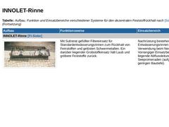Solche Anforderungen erfüllen die in den letzten Jahren entwickelten und in der folgenden Tabelle ohne Anspruch auf Vollständigkeit vorgestellten Spezialstraßenabläufe: Tabelle: Aufbau, Funktion und Einsatzbereiche verschiedener Systeme für den dezentralen Feststoffrückhalt nach [Somme2009] |