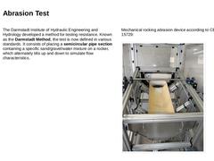 The Darmstadt Institute of Hydraulic Engineering and Hydrology developed a method for testing resistance. Known as the Darmstadt Method, the test is now defined in various standards. It consists of placing a semicircular pipe section containing a specific sand/gravel/water mixture on a rocker, which alternately tilts up and down to simulate flow characteristics. Mechanical rocking abrasion device according to CEN/TR 15729: (Image: Mechanical rocking …