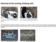 (Image: Cutting off the step rings with the angle grinder ) (Image: The relatively new step rings are cut off ) The climbing aids consisted of relatively new step rings - single row (blue). These were cut off with an angle grinder and the protruding steel remains from step rings were then ground off. The remaining old step rings (double row) were knocked off with a hammer. (Image: step rings) (Image: Residues of the knocked off old step rings and new …