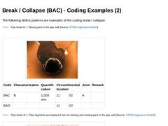 When quantifying the defect, the length of the pipe break / collapse should, where possible, be specified in mm (in), given that it is smaller than 1,000 mm (39 in) in length. For lengths that exceed 1,000 mm (39 in) in a longitudinal direction, the start and the end shall be determined and recorded. The position of break / collapse must be recorded in any case. (Image: Structural defect - Broken pipe in a concrete sewer (missing wall part, transverse …
