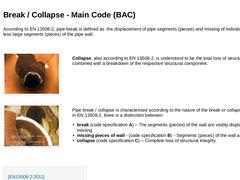 According to EN 13508-2, pipe break is defined as the displacement of pipe segments (pieces) and missing of individual, more or less large segments (pieces) of the pipe wall. (Image: Pipe break – Missing parts in the pipe wall) Collapse, also according to EN 13508-2, is understood to be the total loss of structural integrity combined with a breakdown of the respective structural component. (Image: Burst pipe / collapse (BAC) in a sewer)