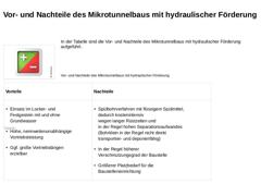 (Bild: Plus/Minus) In der Tabelle sind die Vor- und Nachteile des Mikrotunnelbaus mit hydraulischer Förderung aufgeführt. (Tabelle: Vor- und Nachteile des Mikrotunnelbaus mit hydraulischer Förderung) |