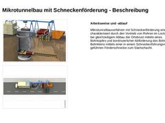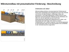 (Bild: Mikrotunnelbauverfahren mit pneumatischer Förderung beim einphasigen Vortrieb) (Bild: Ausrüstung, mögliche Anordnung der Komponenten auf der Baustelle und erforderlicher Platzbedarf (ca. L x B = 34 x 4 m) beim Mikrotunnelbau mit pneumatischer Förderung - Draufsicht (am Beispiel des Vortriebes von Rohren DN/ID 600, Baulänge 2,0 m)) Arbeitsweise und -ablauf Mikrotunnelbauverfahren mit pneumatischer Förderung auf Basis einer Sauganlage sind charakterisiert …