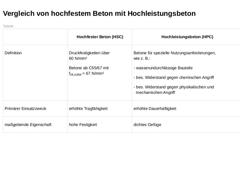 (Tabelle: Gegenüberstellung von hochfestem Beton (HSC) und Hochleistungsbeton (HPC))