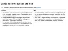 (Table: Demands on the subsoil and mud for the use of earth pressure balance shields) |