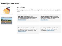(Image: Surface water) (Image: Terms for flows derived from rain water according to DIN EN 752) What is runoff? The image gives an overview of the terminology for flows derived from rain water (precipitation water). Rain water: "water arising from atmospheric precipitation, which has not yet collected matter from the surface" [EN16323:2014]. Surface receiving water: "receiving water body that is on the surface of the ground (e.g. river, lake or sea)" …