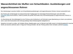 Die Verbindungen zwischen Muffen von Schachtbodenauskleidungen und angeschlossenen Rohren müssen wasserdicht sein. Die Prüfung der Verbindungen ist entsprechend den Festlegungen für erdverlegte Rohrverbindungen nach DIN 4060 [DIN4060:1998] durchzuführen. Dabei ist jeweils die größte Nennweite einer Nennweitengruppe je angeschlossener Rohrart zu prüfen. Zur Beurteilung der Wurzelfestigkeit ist eine Prüfung unter Außendruck und Scherlast sowie Abwinkelung …