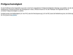 Für die Prüfkörper ohne Fügestelle ist aus den in der Norm angegebenen Prüfgeschwindigkeiten diejenige auszuwählen, bei der die Reißkraft bzw. Kraft bei Erreichen der Streckgrenze in etwa 1 Minute erreicht ist. Für die Prüfkörper mit Fügestelle ist die so ermittelte Prüfgeschwindigkeit zu wählen.