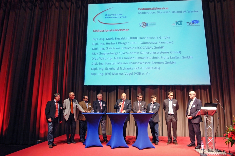 In der abschließenden Podiumsdiskussion unter Leitung von Dipl.-Oec. Waniek, IKT, tauschten Hersteller, Planer und Auftraggeber ihre Erfahrungen mit Reparaturtechniken aus (Foto: VSB)