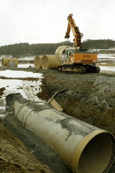 Herbst 2007: Warten auf „Bauwetter“ In Berg wurden im Herbst 2007 die ersten, jeweils 6 Meter langen FLOWTITE-Rohre DN 2900 angeliefert, ebenso das Zulaufbauwerk und das Entlastungsbauwerk, ein fünfeinhalb Metern hoher, mit allen Anschlüssen maßgefertigter Schacht DN 2900 mit innenliegendem Quelltopf. Der völlig verregnete Spätsommer und Herbst 2007 hatte die Baudurchführung in dem durchfeuchteten Gelände etwas zurückgeworfen. Da GFK-Elemente jedoch auch in dieser Größenordnung schnell und unproblematisch zu installieren sind, sind sich alle Beteiligten sicher, dass der weltweit einzigartige Kaskaden-Staukanal von Berg und die neue Kläranlage trotz der aktuellen Verzögerung pünktlich Anfang August 2008 für die Ortsteile Berg, Hadermannsgrün und Eisenbühl in Betrieb gehen werden.