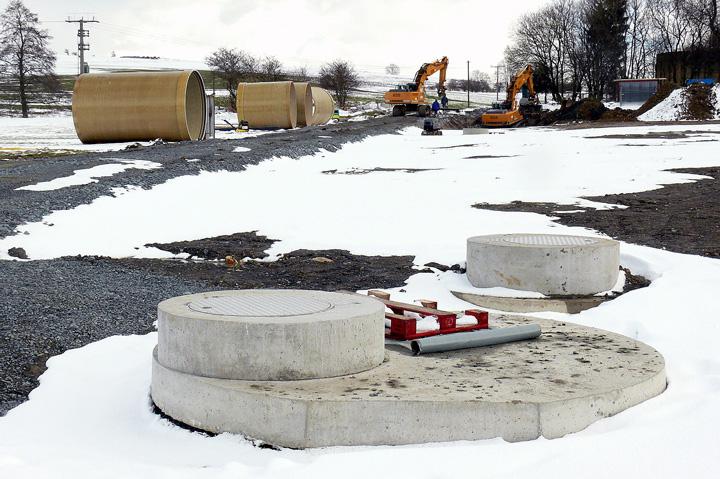 In der 2700-Einwohner-Gemeinde Berg steht im Zuge der Neuorganisation der in die Jahre gekommenen Abwasser-Infrastruktur auch der Neubau einer Kläranlage im Ortsteil Eisenbühl an, das künftig die Abwässer von drei Ortsteilen aufnehmen soll. Da die vorhandenen Mischwasserleitungen jedoch nach der Zusammenlegung für Spitzenlast-Zeiten erkennbar zu knapp bemessen sind, komplett neue Leitungen jedoch nicht verlegt werden sollten, musste der Kläranlage nach den Planungen des für beide Projekte zuständigen Ingenieurbüros USS Consult, Naila, ausreichender Stauraum im Netz vorgeschaltet werden. Hinzu kommt, dass die Kläranlage nach dem SBR-Verfahren arbeitet. Bei der Sequencing Batch Reactor-Technologie wird der Abwasseranfall nicht kontinuierlich abgearbeitet, sondern in einem mehrstündigen Prozess chargenweise gereinigt. Der erfolgreiche SBR-Chargenbetrieb setzt eine exakte Steuerung des Anlagen-Inputs nach Qualität und Menge voraus. Insofern spielt die Möglichkeit eines stromauf liegenden zusätzlichen Speichervolumens im Netz auch eine Rolle für die Sicherheit des Kläranlagen-Betriebs.