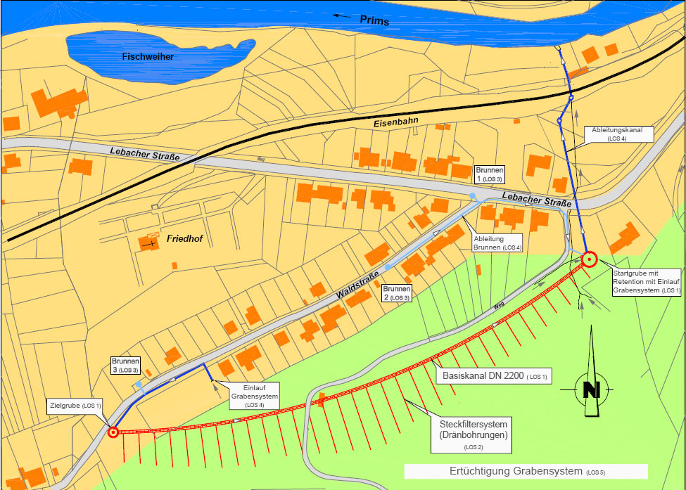 Dieses System besteht aus einem 400 Meter langen, überwiegend im Fels liegenden Basisdrainkanal DN 2200. Von diesem Kanal aus führen 33 bis zu 61 Meter lange Drainlanzen, so genannte Steckfilter, im Winkel von 30 Grad an die Oberfläche und entziehen dem Lockerboden das Wasser. Zusätzlich im Basiskanal angebrachte Perforationsbohrungen wurden mit kurzen Filterrohren versehen.