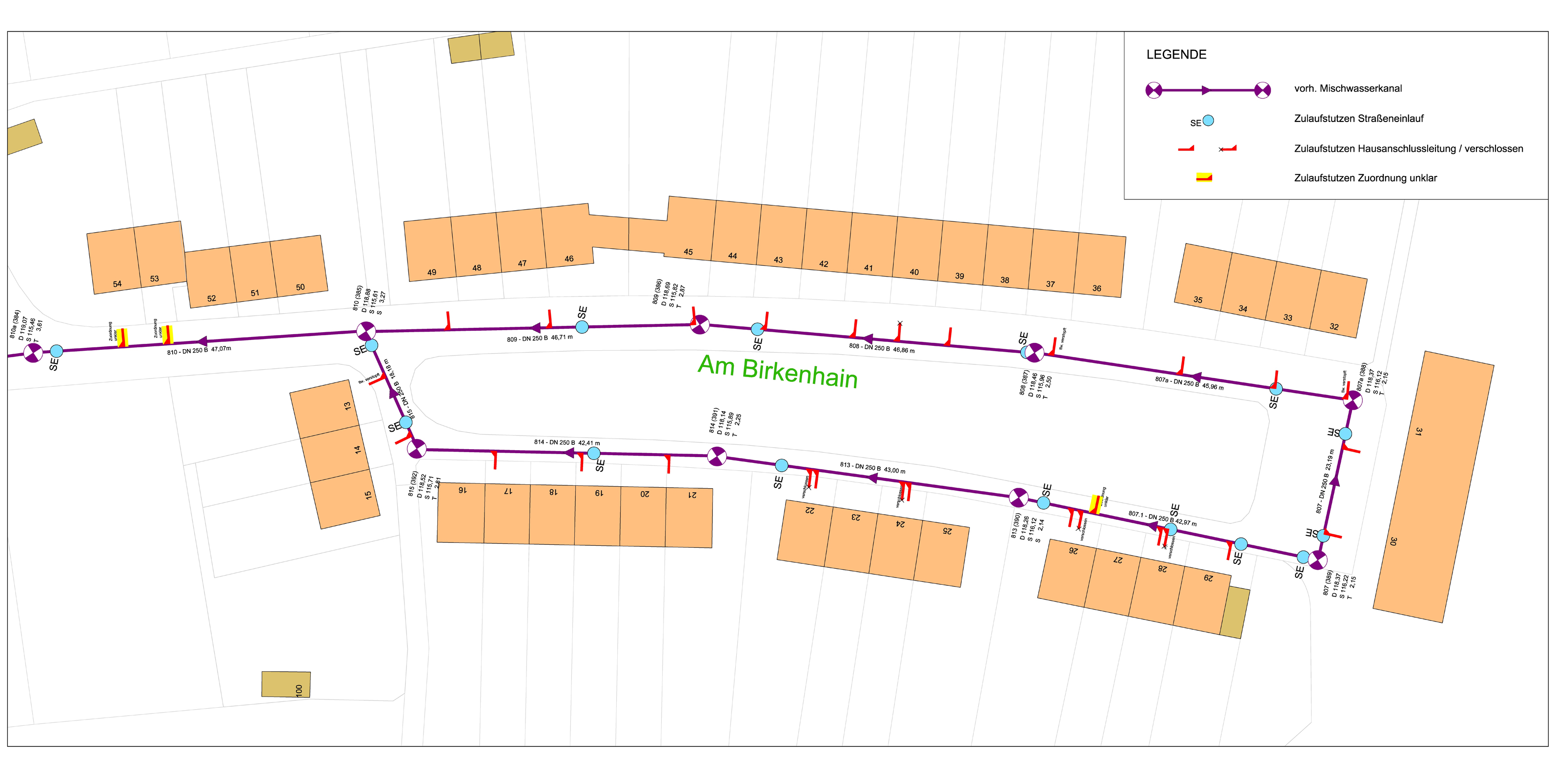 Gleich zu Beginn stellte sich die Frage, wie mit Hausanschlussleitungen umgegangen werden konnte, denn ihr Verlauf war nicht ausreichend dokumentiert: Eine TV-Befahrung des Hauptkanals gab Aufschluss über Lage und Anzahl der Anschlussstutzen. Nicht bekannt waren jedoch Verlauf und Zustand der Anschlussleitungen. Auch musste berücksichtigt werden, dass sich möglicherweise nicht alle Anschlüsse in Betrieb befinden. Unklar war ebenfalls, ob jedes Haus eine separate Anschlussleitung hat oder ob jeweils zwei Häuser an einer Leitung angeschlossen sind, worauf die Anzahl der Anschlussstutzen im Hauptkanal hindeuteten. Wie viele Leitungen waren also wo zu planen?