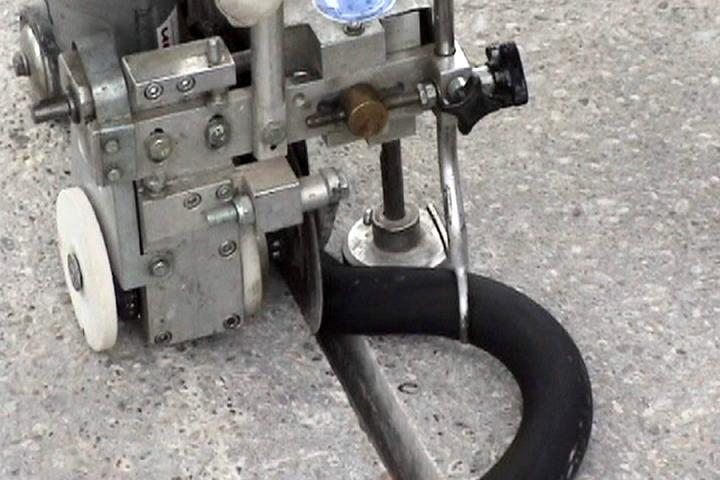 Zur Vermeidung von unzulässigen Dehnungen wird der Dichtstrang lose auf der Fuge ausgelegt und in Abständen von max. 30 x d (d = Profildurchmesser) punktuell in die Fuge eingebracht und damit an diesen Stellen befestigt. Das Profil wird dabei auf ca. 2/3 der endgültigen Einbautiefe eingebracht. Wenn diese Vorbefestigungen erfolgt sind, kann das Profil auf ganzer Länge bis auf die endgültige Tiefe eingebaut werden. Der Einbau der Profile kann per Hand oder maschinell erfolgen (s. Abb. 2 und 3). Verdrehungen müssen dabei unbedingt vermieden werden. Es muß weiterhin sichergestellt werden, daß auf 1,0 m Fuge auch tatsächlich 1,0 m Dichtungsprofil eingebaut wird und nicht durch Überdehnung beispielsweise nur 0,90 m (auf 1,00 m gestreckt) eingebaut werden. Dieses würde die Wirksamkeit der Kompressionsdichtung sehr stark beeinträchtigen.An Verbindungsstellen werden die Profile miteinander verklebt. Dabei müssen saubere, planebene und trockene Schnittstellen hergestellt werden. Die Enden der Profile müssen lose in Kontakt miteinander gebracht werden können, ohne dass eine Spannung entsteht. Eine Schnittfläche wird dünn mit dem Spezialkleber SICOMET 8300 eingestrichen und unmittelbar danach an die andere Schnittfläche herangeführt (Abb. 4). Die beiden Schnittstellen werden dann ca. 15 Sekunden lang stark aneinander gepresst, so dass eine einwandfreie Verklebung erfolgen kann. Der Klebstoff muß bei Temperaturen von max. 15 °C kühl gelagert werden.