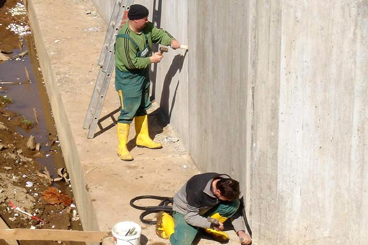 In Kerpen-Horrem und in Mödrath werden zur Zeit zwei Rückhaltebecken komplett saniert (Abb.5). Die im Jahr 1985 gebauten Bauwerke werden aufwändig an den Betonbauteilen instandgesetzt. Die alten Fugenfüllungen werden entfernt und die Fugenkanten saniert. Die ebenfalls durch die DENSO GmbH akkreditierte und geschulte Firma Liedmann Bautechnik GmbH aus Frechen-Bachem baut in die etwa 20 bis 25 mm breiten Fugen das FERMADUR C in Durchmessern von 32 bis 36 mm in den Sohlen- und Wandbereichen ein. Im ersten Bauabschnitt im November und Dezember 2004 wurden am Regenüberlaufbecken Horrem ca. 195 lfdm Profile eingebaut. Aufgrund der Materialeigenschaften verlief der Einbau selbst bei Temperaturen um die 0° C Grenze und teilweise feuchter Witterung reibungslos ab. Auch dem höchsten Wasserstandsspiegel von 4,0 bis 5,0 m halten die Fugen problemlos Stand. Der zweite Bauabschnitt am RÜB Mödrath wird etwa im Mai 2005 erfolgen.