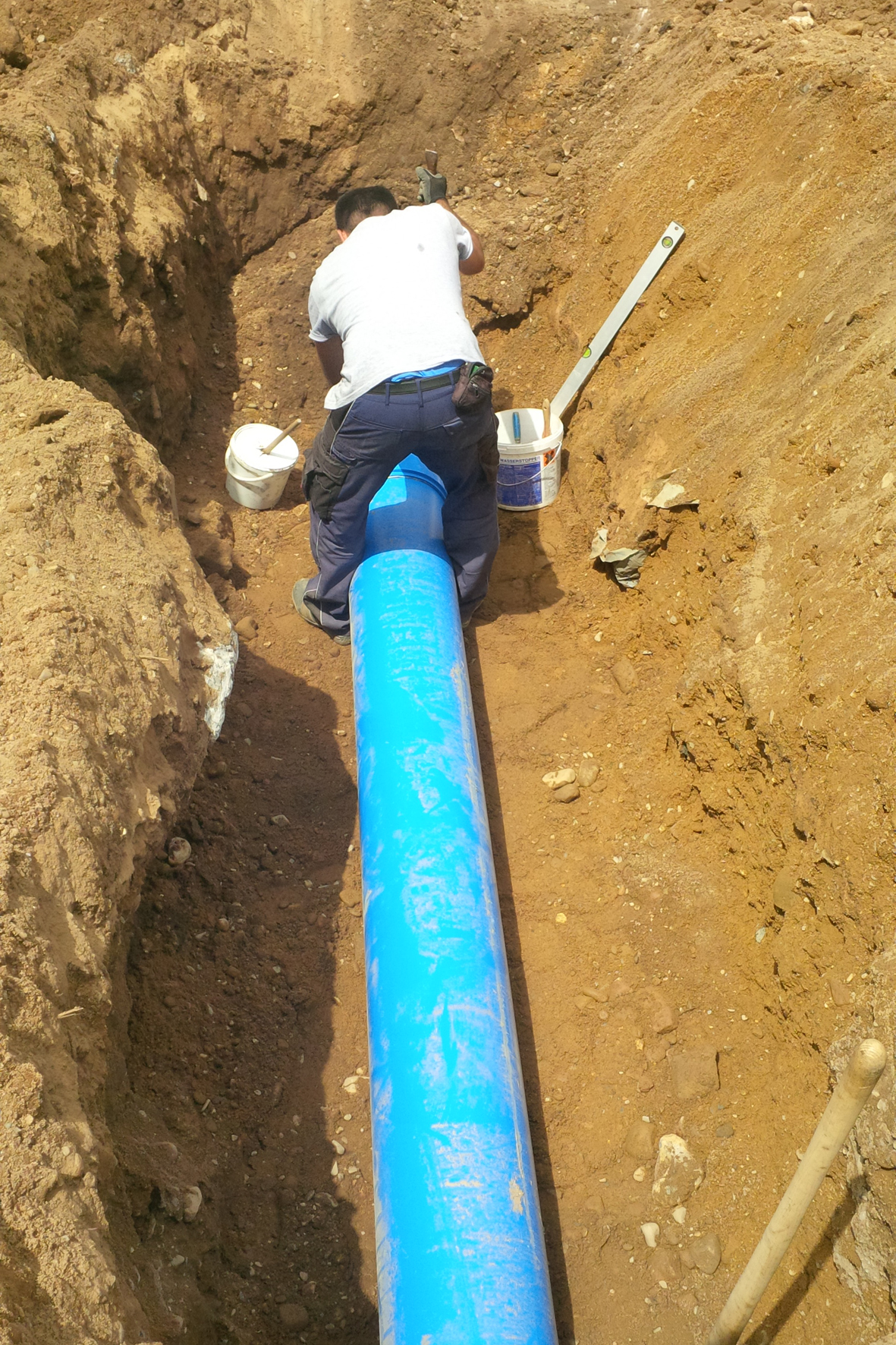 Auch Bauleiter Dipl.-Ing. Hubert Hartung von der Walter Feickert GmbH zeigt sich angetan von den Anschlüssen: "Dank der CONNEX-Anschlüsse konnten wir die spannungsfreien Hausanschlüsse sehr zeit- und kostensparend realisieren." Insgesamt verlegt wurden rund 2000 m Regenwasser- und Schmutzwassersammler mit HS®-Kanalrohrsystem blau (RW) und braun (SW) im Nennweitenbereich von DN/OD 250 bis DN/OD 630, zusätzlich wurden rund 300 m Hausanschlussleitungen verlegt. Hier kamen HS®-Kanalrohre DN/OD 160 in blau und braun zum Einsatz, die vom Sammler bis jeweils 1 m über die Grundstücksgrenzen hinaus verlegt und mit einem Revisionsschacht versehen wurden.