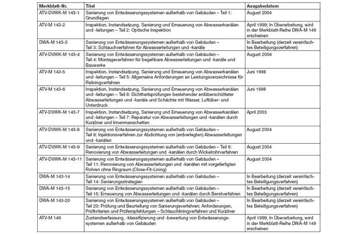 Einen wesentlichen Beitrag zur wirtschaftlichen und wirksamen Realisierung dieser Zielstellungen sowie zur Qualitätssicherung der dabei auszuführenden Arbeiten leisten die Regelwerke der DWA und hier insbesondere die Regeln des Fachausschusses ES-8 "Zustandserfassung und Sanierung", auf welche nachfolgend näher eingegangen werden soll.