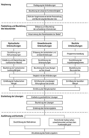 Die grundsätzliche Vorgehensweise bei der Sanierung bestehender Entwässerungssysteme ist im ATV-DVWK-M 143 Teil 1 dargestellt (Abbildung 1), wobei insgesamt vier Arbeitsschritte unterschieden werden: