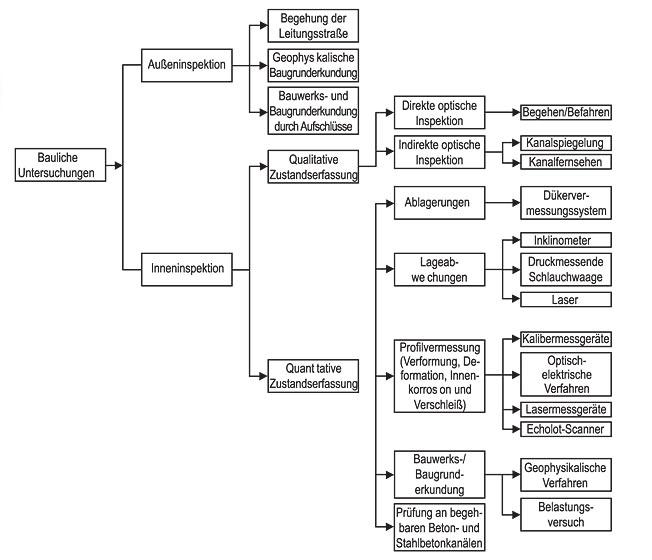 Grundvoraussetzungen für eine fachgerechte Sanierungsplanung sind die Kenntnis und Berücksichtigung aller maßgeblichen baulichen, hydraulischen und ökologischen sowie leitungsspezifischen Randbedingungen, die nur durch Erfassung und Beurteilung der vorhandenen Informationen und durch eine dem Objekt und der Aufgabenstellung angepasste Inspektion, d. h. Zustandserfassung und -beurteilung, geschaffen werden können. Maßgebliche Regel der Technik für die bauliche Zustandserfassung ist die optische Inspektion. Sie gehört zu den Methoden der qualitativen Inspektion und erfolgt in begehbaren Kanälen im Allgemeinen durch direkte Inaugenscheinnahme, in nichtbegehbaren durch eine Kamerabefahrung [3, 4]. Während der Inspektion sollte der Inspektionsabschnitt gereinigt und von Abwasser frei sein, da nur dann der gesamte Kanalquerschnitt optisch inspiziert werden kann. Reichen die so gewonnenen Inspektionsergebnisse als Entscheidungsgrundlage zur Beurteilung des Istzustandes und ggf. zur Festlegung von Sanierungsmaßnahmen nicht aus, so sind weitergehende Untersuchungen zur quantitativen Schadenserfassung durchzuführen. Einen Überblick über die dabei zur Verfügung stehende Verfahrensvielfalt zur baulichen Untersuchung von Entwässerungssystemen vermittelt Abbildung 2.