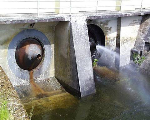 Um den Anforderungen der DIN 19700 gerecht zu werden, wurden die alten Ringventile durch leistungsstärkere VAG Kegelstrahlschieber DN 1800 ersetzt. Damit ihre Funktionssicherheit auch bei großen Differenzdrücken gewährleistet ist, wurden die beiden Kegelstrahlschieber DN 1800 mit einem zusätzlichen Anschlussflansch der Nennweite DN 3200 und Mauerrohren im gleichen Durchmesser hergestellt. Die Mauerrohre dienen als Belüftungseinrichtungen für die Kegelstrahlschieber und haben beiderseitig unter 45° schräg nach oben angeordnete Belüftungsstutzen vom Durchmesser DN 400. An diese Stutzen sind beiderseitig Rohrleitungen der Nennweite DN 400 angeschlossen und durch das Beton-Widerlager der Außenwand hochgeführt, um von außen Luft anzusaugen. Durch den am Dichtsitz des Kegelstrahlschiebers entstehenden Unterdruck wird über die Belüftungsrohre von aussen Luft angesaugt, wodurch das Entstehen von Kavitation verhindert wird (Bild 4).