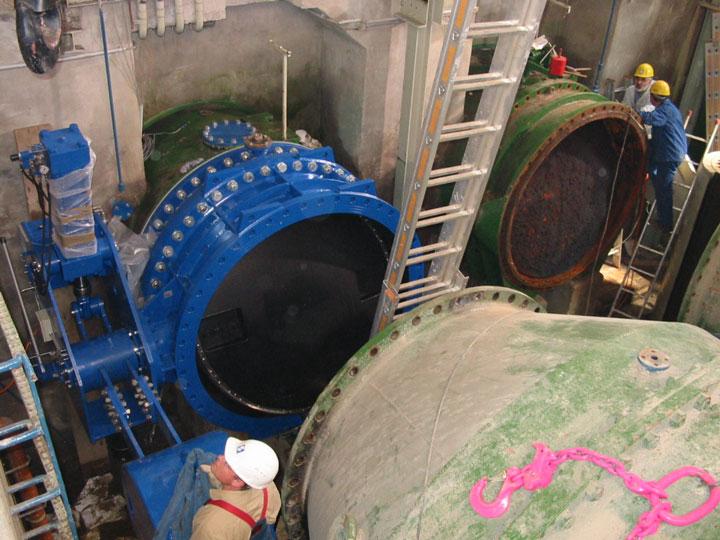 Der Einbau der 3 VAG EKN Absperrklappen wurde maßgeblich durch den Platzmangel im Schieberhaus beeinflusst. Die Rohrbruchsicherungsklappen mussten als Schweisskonstruktionen in Kurzbaulänge gefertigt werden. Zur Herstellung der Klappenscheiben wurden spezielle Modelleinrichtungen angefertigt, um die Klappenscheiben sehr strömungsgünstig auszuführen.