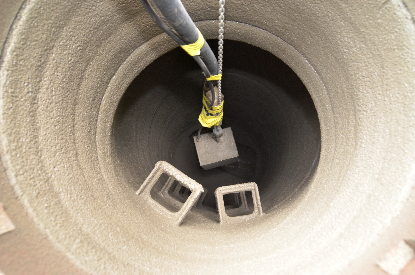 Nach Abschluss der Untergrundvorbereitung erfolgte die Beschichtung der durchschnittlich 2,0 – 3,5 Meter tiefen Schächte mit Hilfe der Spinning Unit durch die Heikaus KS. Die Spinning Unit verfügt über einen rotierenden Schleuderkopf, der den speziell für die Spritz- und Schleuderverarbeitung entwickelten Hightech-Mörtel ombran MHP-SP auf den vorbereiteten Untergrund aufbrachte. Im Schleuderkopf wird durch Rotationsenergie das Material beschleunigt und durch die hohe Geschwindigkeit beim Aufprall verdichtet. Zusätzlich sorgt die DySC®-Technologie[1] des Reprofilierungs- und Beschichtungssystems für eine weitere Verdichtung der Mörtelmatrix während der Lebensdauer. Der Porenraum wird fortlaufend minimiert und verhindert das Eindringen aggressiver Stoffe.