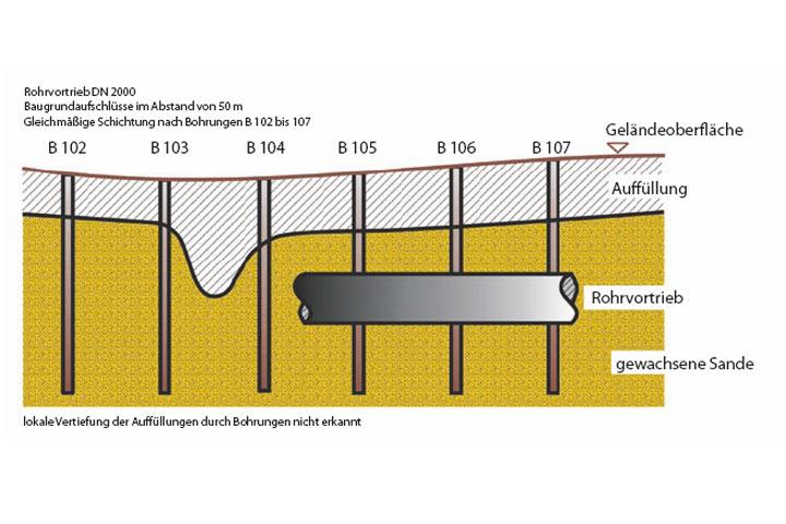 Ziel des Rohrvortriebs ist es, Vortriebs-/ Produktrohre von einem Startschacht aus durch den Baugrund in eine Zielbaugrube vorzutreiben. Der zu durchfahrende Baugrund stellt für den Vortrieb die maßgebliche Ausführungsrandbedingung und damit im Hinblick auf die Risiken das maßgebliche Risiko dar. Es ist völlig unzureichend, den Baugrund nur im Bereich von Start- und Zielschacht aufzuschließen und hieraus auf den Baugrund zwischen den beiden Schächten zu schließen. Vielmehr sind die Untergrundverhältnisse im Bereich der Vortriebsstrecke gezielt zu untersuchen, so dass mögliche Unwägbarkeiten wie Baugrundschichtung, Boden-/Felsarten, Grundwasser, mögliche Hindernisse aus Baulichkeiten, Auffüllungen und vieles andere mehr weitestgehend ausgeschlossen werden können (Bild 3).