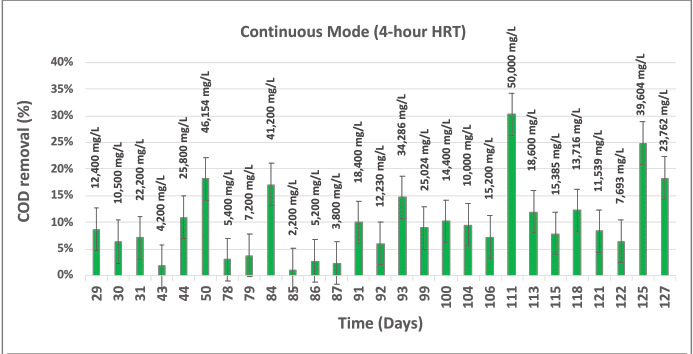 The BETT Demo Unit accomplished an average 10% COD removal (18,377 mg/L) in a 4-hour hydraulic residence time with only 12 BETT reactors in hydraulic series (Fig. 2). The COD removal capacity of the system ranged from 2,200 mg/L to 50,000 mg/L. Lower removal rates were observed when reestablishing continuous mode after planned facility shutdowns. The system only requires 24-48 hour recovery period to reach normal performance metrics after a system shut-down or batch operation. These results showcase how microbial fuel cells can be used for treatment of high-organic wastewaters. Further, the system scales modularly. By adding more reactors in a treatment train, and operating multiple treatment trains, the BETT reactors can be used to remove up to 95% of organics with flows between 2,500 gpd to 10,000 gpd.