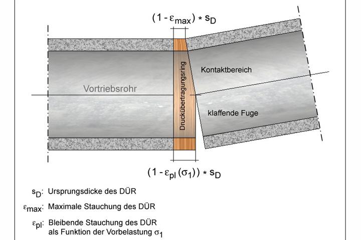 Die zentrale Problematik bei der Übertragung der Vortriebskräfte von Rohr zu Rohr besteht darin, dass sich der Rohrstrang insbesondere in engen Kurven nicht kontinuierlich krümmt, sondern die verhältnismäßig steifen Rohre aus Stahlbeton gerade bleiben und in den Fugen entsprechende Abwinkelungen entstehen. Dabei entsteht eine so genannte klaffende Fuge. Die Druckübertragungsfläche verkleinert sich, wodurch die Kontaktdruckspannungen zwangsläufig ansteigen. Dieser unerwünschte Effekt wird in der Regel durch die Verwendung von Druckübertragungsringen aus Holz oder Holzprodukten gemildert, die sich unter Last infolge ihrer geringeren Steifigkeit beidseitig an die Rohrspiegel anlegen, den Kontaktbereich vergrößern und somit spannungsreduzierend wirken [...].