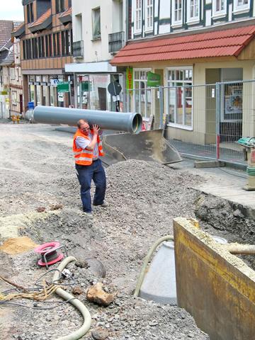 Im Zuge dieser Aus- und Umbaumaßnahmen werden von März bis September dieses Jahres im Bereich Mittelstraße, Kirchgasse und Schulgasse 455 m Mischwasserkanal in der Nennweite DN/OD 315 erneuert. Auftraggeber und Planer haben sich erstmals für den Einsatz von CONNEX®-Kanalrohren entschieden. "Neben dem guten Preis-Leistungsverhältnis waren es vor allem bautechnische Gründe, die bei der Wahl des Rohres eine Rolle gespielt haben", erinnert sich Dipl.-Ing. Klaus Dieter Dolk, Ingenieurbüro Bick. Darüber hinaus erklärte der Hersteller sich sofort bereit, die gewünschte Baulänge von 2 m als Sonderanfertigung zu produzieren. Das hat sich bezahlt gemacht: "Die kurzen Rohre harmonieren perfekt mit den eingesetzten Verbaumodulen", so Dolk weiter. "Zudem sorgen vor allem das niedrige Gewicht des Rohres und die einfache Steckmuffenkonstruktion für rationelles Arbeiten und einen zügigen Baufortschritt." Eine wichtige Voraussetzung bei den Tiefbauarbeiten in der Altstadt von Zierenberg. Das ausführende Unternehmen arbeitet sich mit möglichst kurzen Haltungen durch die
