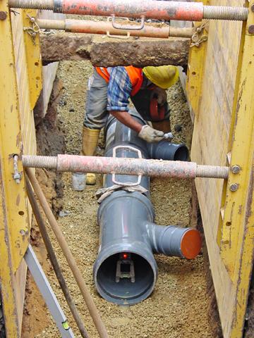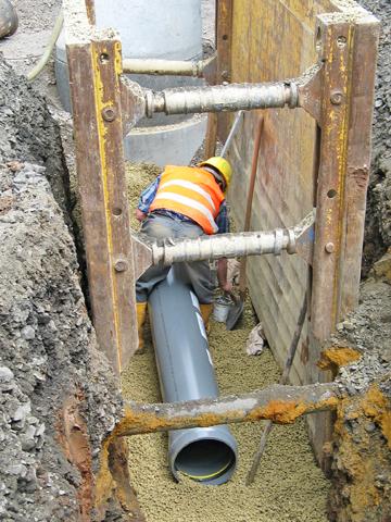 Mit dem 45°-Standardabzweig DN/OD 315/160 werden die mehr als 100 Hausanschlussleitungen eingebunden. Auch hier kommt mit dem HS®-Kanalrohrprogramm ein Produkt von Funke zum Einsatz. Sämtliche Bauteile des Rohrsystems sind ebenfalls wandverstärkt. So halten Rohre und Formstücke starke Druckbelastungen aus und sind bereits bei Überdeckungen von 0,5 - 0,6 m für Verkehrslasten bis SLW 60 einsetzbar. Die gemessene Ringsteifigkeit liegt bei 12KN/m2. Die gute Hydraulik und die absatzfreien Verbindungen fördern eine sichere Wasserableitung. Die wurzelfesten und wurzeldichten Rohrverbindungen sind schlagzäh und lassen sich schnell und einfach einbauen. Das gesamte Rohrsystem erfüllt die erhöhten Anforderungen der ATV A 142 - druckdicht bis 2,5 bar - und ist somit auch in wassergewinnungsgebieten der Zone II/III einsetzbar. Außerdem fällt bei der Verlegung kein Abfall an. Da die Rohre muffenlos gefertigt und die Rohrverbindungen mit speziellen Doppelmuffen hergestellt werden, können die Abschnitte weiterverarbeitet werden.