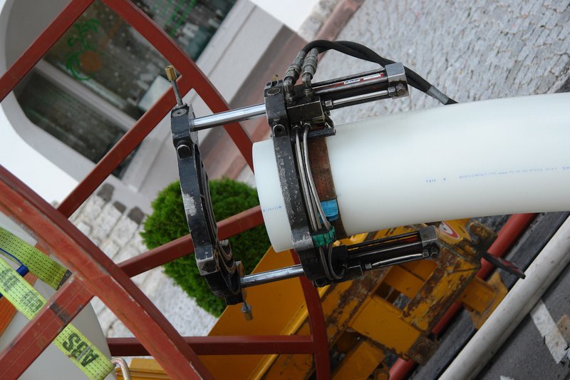 Vor dem Einzug wird ein Zugkopf an den PE-Rohrstrang geschweißt (Foto: DIRINGER&SCHEIDEL ROHRSANIERUNG)