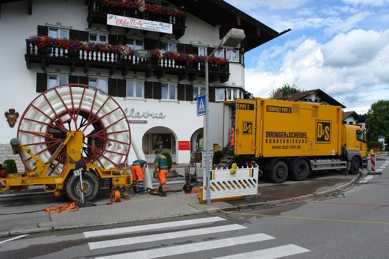Während der Regenwassersammler im Berstlining-Verfahren erneuert wurde, setzte der Auftraggeber bei der Sanierung des Abwassersammlers aus bautechnischen und wirtschaftlichen Erwägungen auf eine Auskleidung im Close-fit-Lining-Verfahren. Zur Anwendung kam das Compact-Pipe-System, das von den Sanierungsprofis der DIRINGER&SCHEIDEL ROHRSANIERUNG GmbH & Co. KG, Niederlassung München, eingebaut wurde. Dabei wird ein werkseitig C-förmig vorverformtes HDPE-Rohr in die gereinigte Haltung eingezogen. Druck und Wärme sorgen dann beim weiteren Arbeitsablauf dafür, dass der Inliner sich durch den so genannten Memory-Effekt close-fit an die Innenwandung des alten Rohres legt. Das Ergebnis ist ein statisch eigenständiges und belastbares Rohr, das in Bezug auf die Qualität mit einer Neuverlegung vergleichbar ist. Zu den weiteren Vorteilen zählt neben der kurzen Einbauzeit der Umstand, dass sich die Beeinträchtigungen für die Anwohner sowie den Fußgänger- und Straßenverkehr in akzeptablen Grenzen halten – ein Aspekt, der vor allem in Hinblick auf den Fremdenverkehrscharakter des Kur- und Urlaubsortes Bad Wiessee eine wichtige Rolle spielte.