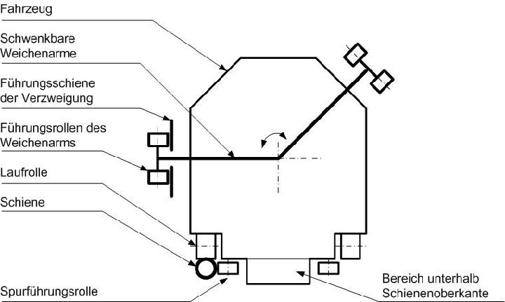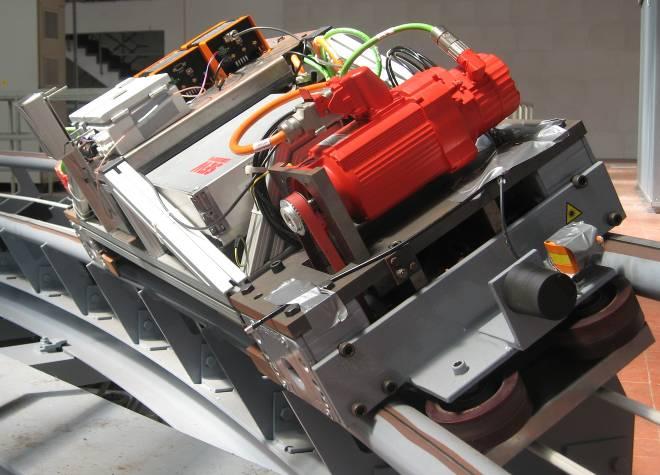 Laufrollen übernehmen die Tragfunktion der Fahrzeuge auf der Schiene, seitliche Spurführungsrollen stellen ihre Führung im Fahrweg sicher. Jede der Laufrollen wird durch einen Synchronmotor angetrieben. Diese Elektromotoren sind in großer Vielfalt am Markt verfügbar und technisch ausgereift. Zusätzlich gewährleistet das gewählte Antriebskonzept mit auf alle Räder verteilten Motoren eine optimale Traktion bei hoher Betriebssicherheit.