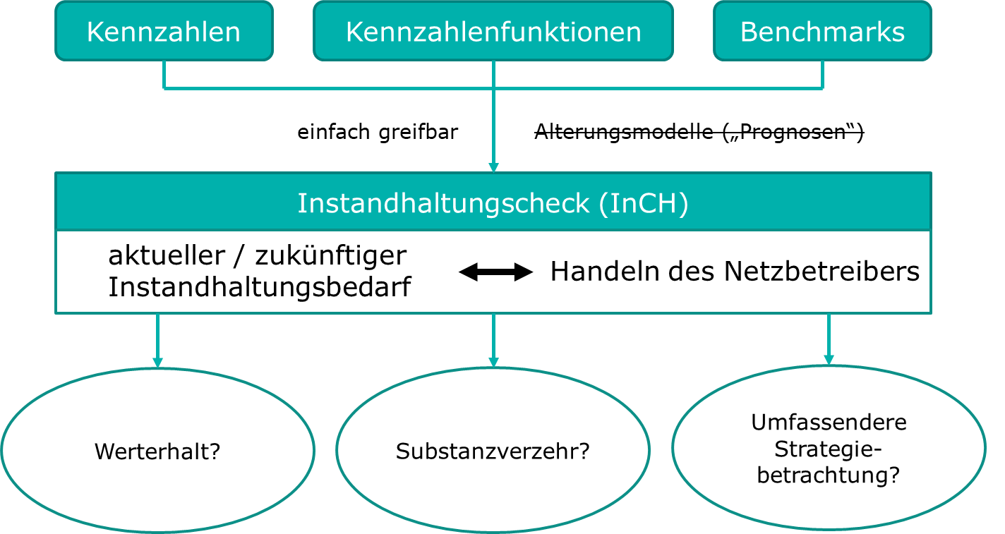 Grundidee des Instandhaltungschecks (InCH) ist, Betreibern von Kanalisationsnetzen eine einfache Einordnung bzw. Bewertung ihrer Instandhaltungsstrategie zu ermöglichen und Wege aufzuzeigen ggf. erkannte Defizite in der Strategie zu beheben.