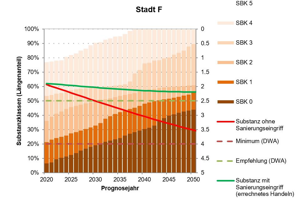 Zum Betrachtungszeitpunkt (Jahr 2020) verfügt das Netz mit einem durchschnittlichen relativen Substanzwert von > 60 %. Dieser liegt mehr als 10 Prozentpunkten oberhalb der DWA-Regelwerksempfehlung aus DWA-A 143-14 (DWA, 2017) zum durchschnittlichen Substanzwert und ist für ein gewachsenes Netz als gut zu bezeichnen. Ohne Sanierungsintervention nimmt dieser Wert zügig ab, und fällt in Richtung des Minimums von 20% aus DWA-A 143-14 (DWA, 2017). Die Zunahme der Klassenanteile in der absorbierenden Substanzklasse SBK 0 ist der augenfälligste Ausdruck dafür und ein Hinweis auf den zunehmenden Renovierungs- und Erneuerungsbedarf.