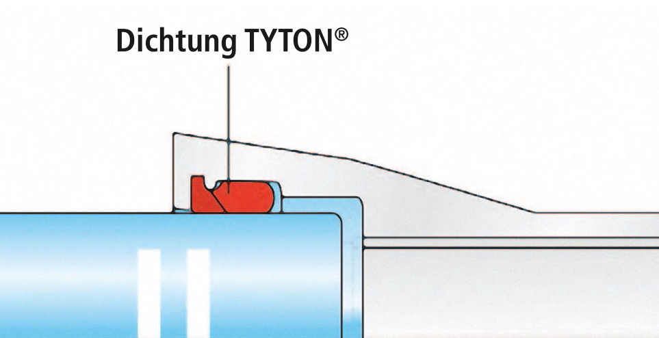 In den fünfziger Jahren wurde die Verbindungsmontage nochmals vereinfacht durch die Einführung der Steckmuffen-Verbindungen des Typs „TYTON®“ (Bild 4) und „Standard“. Diese Konstruktionen sind so bemessen, dass die Dichtheit durch einfaches Einschieben des Einsteckendes in die mit einer Dichtung versehene Muffe bewirkt wird, und zwar belastbar bis zum Berstdruck der Rohre, unter Beibehaltung der Beweglichkeit und über eine Nutzungsdauer von 100 Jahren, von denen inzwischen 60 Jahre bereits praktisch nachgewiesen sind.